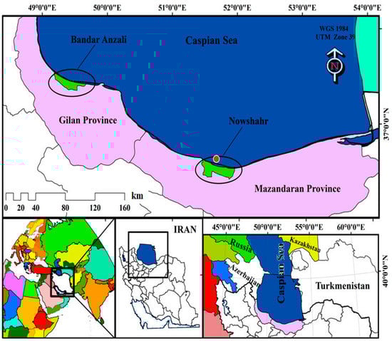 As illustrated in the following Figure 1, the study site examined in the present study is embodied by the coastal region of Mazandaran Province (northern Iran), in the southern region of the Caspian Sea. Specifically, the study area is located within the latitude of 35.47° to 36.35° and the longitude of 50.34° to 56.14°.