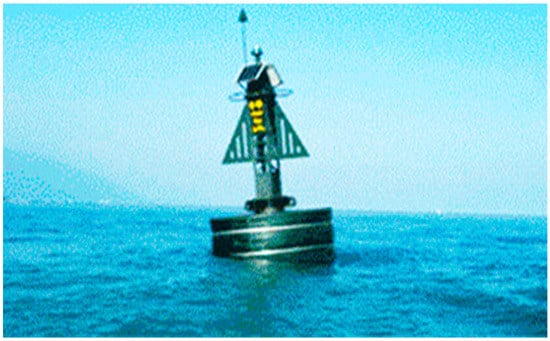 Nowshahr buoy (36°42′09″ N, 51°37′17″ E) data consist of wave heights (m), velocity, direction, and other key parameters, which were derived from the Ports and Maritime Organization Iran (PMO) in 2010, as reported in the study carried out by Lesani and Niksokhan []. Specifically, compared with other types, the polyethylene Nowshahr buoy made in Iran, which was employed in the present study case, requires lower regular repairs when dealing with the presence of the most common seaweeds as algae. This buoy is a set of electrical–mechanical equipment through which meteorological and oceanographic parameters can be measured. As shown in Figure 2, the buoy restraint system consists of rubber rope, chains, nylon rope, subsurface buoy, relevant fittings, and gravity anchor. The wave sensor is of the HIPPY type and can measure vertical fluctuations of water up to 10 m with an accuracy of 1.00 cm, and the roll and pitch angles are in the range of 45°. Buoy data include wave height, wind speed and direction, and other parameters such as water and air temperature, humidity, air pressure, etc.