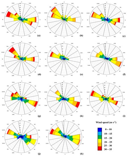 Wind frequency (in percentage, %) diagrams at (a) January, (b) February, (c) March, (d) April, (e) May, (f) June, (g) July, (h) August, (i) September, (j) October, and (k) November 2016.