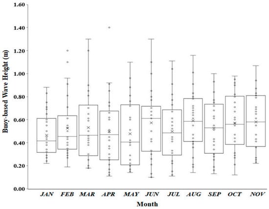 Box plots of buoy-based wave height (m) data over the southern coasts of Caspian Sea region from January to November 2016. The cross indicates the mean of the distribution, while the circles indicate the single buoy-based wave height (m) value.