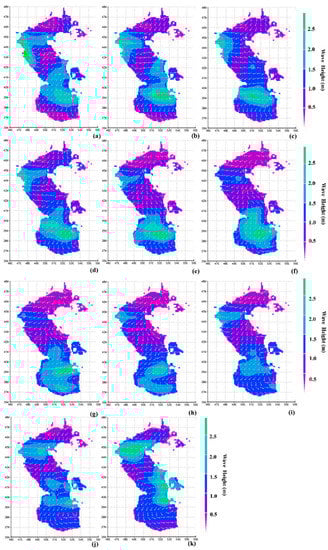 Detailed maps of monthly mean satellite-based wave heights (m) over Caspian Sea flow area in (a) January, (b) February, (c) March, (d) April, (e) May, (f) June, (g) July, (h) August, (i) September, (j) October, and (k) November 2016. The white arrows in all figures indicate the wind velocities, with arrows’ length proportional to speed magnitude, based on 10 knots unit.