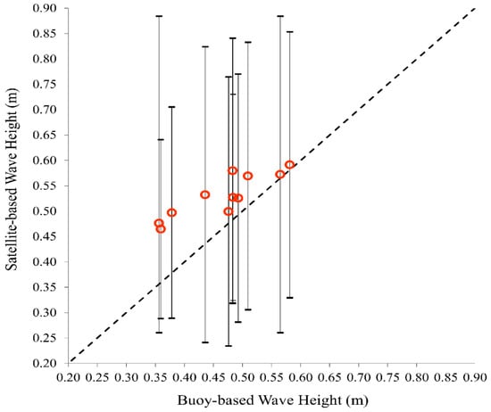 Comparative analysis of monthly average buoy- and satellite-based wave heights (m) over the southern coasts of Caspian Sea flow area in January–November. The black dashed line represents the perfect agreement, while the vertical bars indicate the error bars in terms of ± standard deviation.