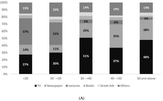 Age and residential time often affected the pattern of how the interviewees answered the same questions (Table 3). The respondents who lived in Wuhan longer or are older tend to consider flood a moderate and significant issue of the city (Figure 3A, Chi = 49.46, df = 12 and p < 0.001, and Figure 3B, Chi = 45.01, df = 12, p < 0.001). Although the SCP was not announced till 2014, allowing most of the respondents equal opportunities to be exposed to the news, the level of awareness of the program was still increased in the groups of longer residential time or the groups of elder ages (Figure 4A, Chi = 45.20, df = 12 and p < 0.001; Figure 4B, Chi = 37.96, df = 12 and p < 0.001). The levels of environmental awareness among the participants seemed to increase when life experience accumulated or attachment to the surroundings potentially grew. We later elaborate on the implication of this in the use of media for broadcasting the information related to Sponge City (Section 5.6).