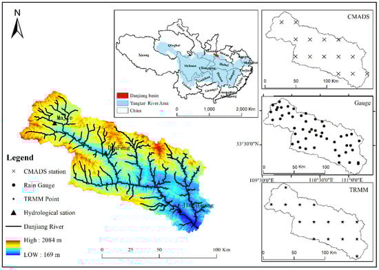 Forestland occupies the largest area in the DRB, followed by the cropland. The yellow-brown soil and sandy loam are the dominant soil types in the DRB []. There are 3 hydrological stations (Majie Station upstream, Danfeng Station midstream, and Jingziguan Station downstream) and 58 ground-based rain gauges in the study area. The digital elevation model (DEM), stream network, weather stations, and hydrological stations are shown in Figure 1.
