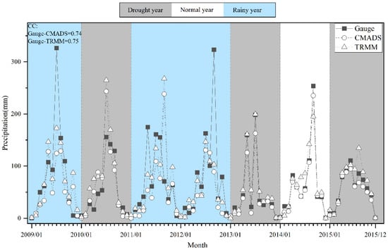 Three different precipitation records at monthly scale in the DRB (the CC value of Gauge-CMADS and Gauge–TRMM were 0.74 and 0.75, respectively; 2009, 2011, and 2012 were denoted as rainy years, 2014 was denoted as the normal year, and 2010, 2013, and 2015 were denoted as drought years. Additionally, the data in this figure were given as year and month.