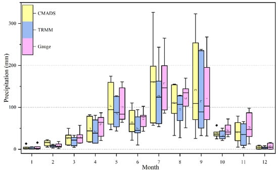 It can be seen from the box plot of Figure 3 that the precipitation featured three peaks, with the peak values appearing in May, July, and September. The monthly precipitation of CMADS had the largest average and median line, while the average and median line of TRMM was the smallest. Moreover, CMADS reported the largest maximum rainfall except in October and December, and TRMM had the smallest minimum precipitation throughout the year. In addition, the PBIAS values of Gauge-CMADS and Gauge-TRMM were −18.86 and 3.20, respectively, indicating that the CMADS precipitation was underestimated compared to the Gauge precipitation, with the TRMM estimation the exact opposite. However, the total precipitation was not much different. In summary, compared with the Gauge records, CMADS tends to overestimate the rainfall, while TRMM tends to underestimate the rainfall.