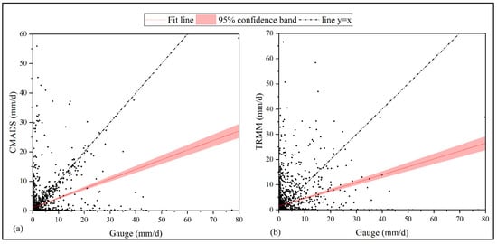 The intensity and frequency of precipitation are the critical parameters used to describe the characteristic of daily rainfall []. It is noted from Figure 4 that the angle between the CMADS model’s 95%-line estimates and the horizontal axis was <45° and that the angle between the TRMM model’s 95%-line estimates and the horizontal axis was <45° as well. This suggested that although the precipitation trends of CMADS and TRMM were similar to that of the Gauge records at a daily scale, the CMADS and the TRMM rainfall data tended to be underestimated when extreme rainstorms occurred. The CMADS and the TRMM, respectively, underestimated the storm rainfall (>50 mm/day) by 13.11% and 10.65%, showing that the CMADS and TRMM were less capable of accurately simulating the storm rainfall than Gauge.