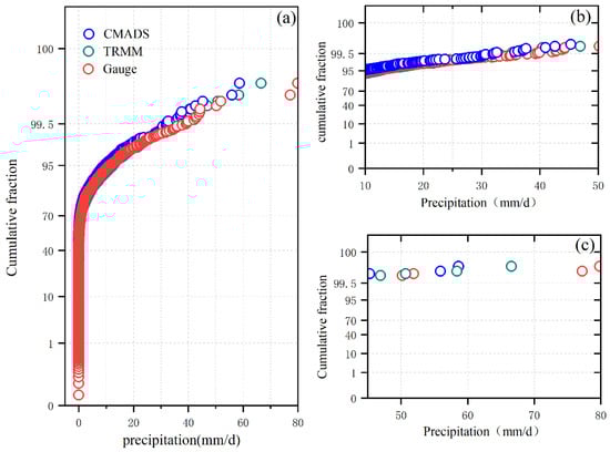 Cumulative frequencies of daily precipitation intensity for Gauge (red points), CMADS (blue points), and TRMM (green points) in the DRB: (a) distribution of all precipitation values, (b) distribution of precipitation values that are <50 mm, and (c) distribution of precipitation values that are ≥50 mm.