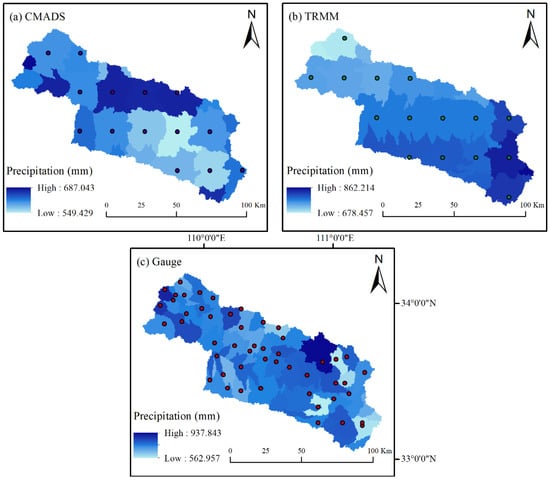 Spatial variation of precipitation at a yearly scale for all sub-basins calculated with precipitation inputs from (a) CMADS, (b) TRMM, and (c) Gauge.