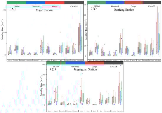 Box plot of the monthly runoff from 2006 to 2015, observed data and simulated streamflow using CMADS, TRMM, and Gauge data at (A) Majie Station, (B) Danfeng Station, and (C) Jingziguan Station.