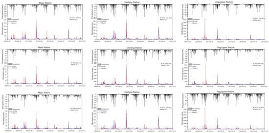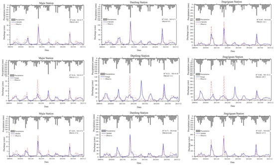 It is noted from Figure 8 that there is a positive correlation between the simulated runoff and rainfall. Moreover, the runoff of the CMADS model had a positive correlation with the measured runoff, but the smaller flood peaks were not simulated in the year when extreme flood events occurred or flood events were relatively continuous. The runoff trend of the TRMM model was similar to the measured runoff in the upper and lower reaches, but several consecutive flood events were simulated as a larger one in the middle stream. Though the runoff of the Gauge model was positively correlated with measured runoff in the upper stream, large floods in certain months were simulated as several smaller flood events in the midstream and downstream.