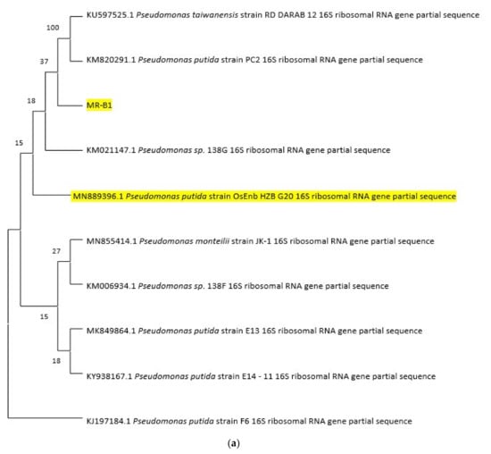 Phylogenetic tree of (a) Pseudomonas putida OsEnB_HZB_G20 strain; (b) Pseudomonas aeruginosa PA1_NCHU (Adapted from [33]) (Highlight and different colors of font represent microbial species of interest for this study).