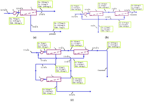 The second-stage membrane quality provides a reduction of lithium of 27–30 times (96.5–96.7% rejection) to provide permeate quality similar to that achieved by the use of reverse osmosis BE membranes. The mixing of the second-stage permeate and third-stage concentrate provides water with higher TDS and calcium concentration values than the first-stage permeate (Scheme shown in Figure 2d).