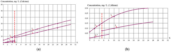Figure 4 shows the dependencies of Ca, Li, and Cl concentrations in concentrate in the first stage and third stage as functions of K. Figure 5 shows the concentrations of these ions in the product on the second stage as dependencies on K. We used 70 NE membranes on the first stage and 90 NE membranes on the second stage. After we produced permeate in the second stage, we implemented mixing with the concentrate produced in the third stage. After mixing, we get water with a calcium concentration of ppm, a lithium concentration of ppm, and a TDS value of ppm. The results of the treatment of the mixture of the second-stage permeate with the third-stage concentrate are presented in Figure 6. During the experiment, conductance and product flow rate were constantly measured to detect membrane flux reduction during the feed water concentration increase. Also, calcium concentrations were measured to calculate calcium carbonate growth rates in membrane modules during constant recovery increases. Results of membrane-specific product rate reduction and calcium carbonate scale increase with coefficient K value growth are demonstrated in Figure 7a,b. Calcium carbonate deposition rates were determined using mass balance techniques described earlier [2]. The techniques are based on the determination of derivatives of the function of the amount of deposited calcium over time.