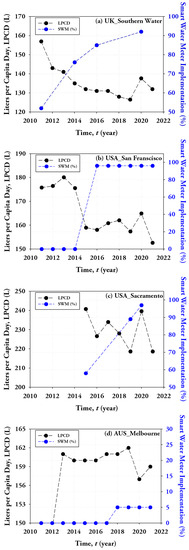 The huge increase in the level of SWM implementation allowed customers to monitor their water usage in real-time through an online portal and helped the city to identify leaks and promote water conservation, resulting in a reduction in LPCD from 176 to 159 L [48]. San Francisco also implemented other initiatives to conserve water, including providing rebates for water-efficient appliances and fixtures and promoting the use of recycled water for non-potable purposes such as irrigation. Despite a temporary increase in water consumption during the COVID-19 lockdown, San Francisco’s LPCD remains at around 159 L, which is among the lowest rates in California and half of the state average [49].
