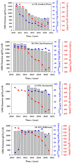 From 2011 to 2021, Melbourne’s LPCDDHW fluctuated between 55 and 61 L, after drought restrictions were lifted in 2010 [64]. Melbourne has a low SWM implementation level of 5% [54], as displayed in Figure 2d, leading to an increase in the LPCDDHW associated with high water consumption, although the city installed water-saving appliances in 2010 [65]. Despite the minor increase in LPCDDHW in 2019, a net reduction in GHG emissions was achieved due to the substantial decarbonization of water heating, where the carbon intensity of water heating significantly decreased, leading to a net decrease in GHG emissions [66].