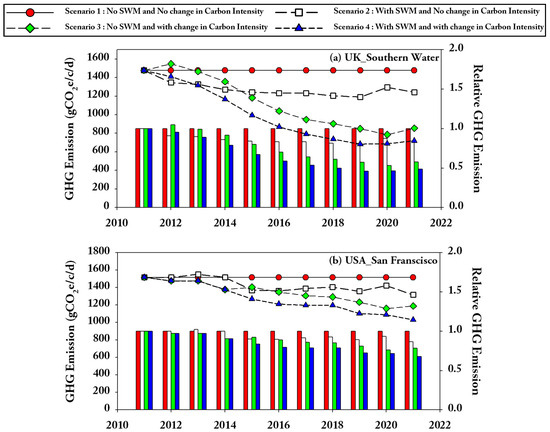 In scenario 2, SWM implementation is the only change from the baseline scenario (scenario 1), and the carbon intensity of water heating remains the same as in scenario 1. Scenario 2 is used to observe the absolute impact of SWM implementation on GHG emissions without any influence from changes in the carbon intensity of water heating. From the results of scenario 2, an increased level of SWM implementation results in a considerable decrease in water consumption; thus, GHG emissions also substantially decline, as presented in Figure 4a,b,e. For instance, Southern Water in Figure 4a and San Francisco in Figure 4b, attaining high and early SWM implementation levels, recorded a notable decrease in GHG emissions due to a reduction in water consumption [41,46]. However, the magnitude of the GHG emissions reduction varied among the five case studies, emphasizing the complex interactions among water conservation interventions, SWM implementation levels, and other factors that impact LPCDDHW. For example, Melbourne exhibited almost similar relative GHG emissions as scenario 1, primarily due to the relatively small reduction in water consumption caused by delayed and low SWM implementation levels [54]. Conversely, Sejong City’s relative GHG emissions in scenario 2 significantly decreased, which is primarily attributed to the rapid reduction in LPCDDHW, possibly driven by increased water prices and the widespread usage of water-saving appliances [69].