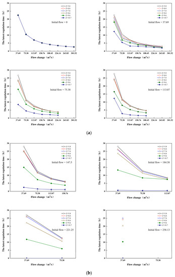 As can be seen from Figure 6a,b, for a drainage basin, as long as the initial flow rate, downstream water level, and the amount of flow variation are determined, there will be the latest regulation time, and for the same initial flow rate and downstream water level, the regulation time will decrease as the amount of flow variation increases; at the same initial flow rate and amount of flow variation, the latest regulation time will decrease as the water level increases. For the same flow change, the relationship between the downstream water level and the initial flow and the latest regulation time, as can be seen from Figure 6c, when the flow change is the same, with the same downstream water level, the latest regulation time with the initial flow increases and then decreases the trend.