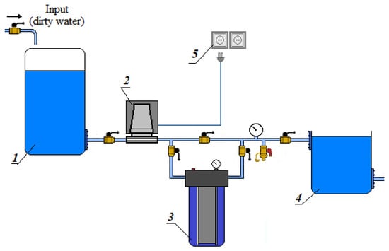 Treatment plant setup: 1—initial water tank; 2—pump; 3—zeolite filter; 4—storage tank; 5—power supply.