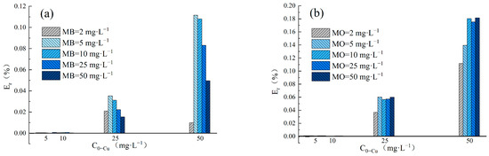 The adsorption Enhancement ratio (Er) was utilized to determine the impact of Cu(II) and dyes in binary systems on the removal performance of LDH@GO-SH. The Er values obtained in MB–Cu and MO–Cu binary systems are presented in Figure 4. The results showed that Er values were nearly zero for Cu(II) adsorption in binary systems at an initial Cu(II) concentration lower than 10 mg·L−1. LDH@GO-SH has a significant adsorption ability, thus the presence of dyes had a negligible impact on Cu(II) adsorption by LDH@GO-SH at low pollutant concentrations. As the concentration of Cu(II) increased to 25 mg·L−1 or 50 mg·L−1, Er-Cu values were greater than zero, signifying that the presence of MB or MO promoted the adsorption of Cu(II) on LDH@GO-SH. As the concentration of MB increased, Er-Cu values first increased but subsequently declined. This trend could be attributed to coexistent MB and Cu(II) in the mixed solution having both competitive and synergistic effects. As the concentration of MB increased, the competition effect between MB and Cu(II) intensified, and the promotion of MB on Cu(II) adsorption was finally weakened. In MO–Cu binary system, Er-Cu values were generally positive for Cu(II) adsorption at the initial Cu(II) concentrations of 25 mg·L−1 and 50 mg·L−1, reflecting efficient synergistic adsorption properties for Cu(II) and MO. Similar trends have been observed by Chen Ling et al. [3] for the synergic adsorption of acid black 1 and copper (II) with hyper-crosslinked resin.