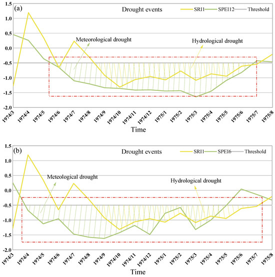 Generally, hydrological drought occurs later than meteorological drought, with a noticeable delay between the two phenomena. According to [41], hydrological drought in the Pearl River Basin lags behind meteorological drought by 2–6 months. The authors of [42] found that hydrological drought in the source region of the Yellow River lags meteorological drought by 3–6 months, and other studies [43] have also demonstrated a lag effect in the propagation of meteorological and hydrological droughts. To examine drought propagation in the MRB, the SPEI and SRI at the 1-, 3-, 6, and 12-month scales of typical drought events from March 1974 to August 1975 were selected for analyses. The yellow- and green-shaded areas represent hydrological drought and meteorological drought, respectively. Drought occurrence is typically defined as a period when the drought index falls below −0.5 for two consecutive months. As shown in Figure 15a, the annual meteorological drought events began in June 1974 and ended in July 1975. Hydrological drought events began in September 1974 and ended in August 1975. Notably, the hydrological drought event occurred three months after the onset of the meteorological drought event and ended one month later. On a seasonal scale, the hydrological drought started five months after the meteorological drought and ended three months after the meteorological drought. In general, the duration of a drought event increases over time. However, except on the annual scale, the peak hydrological drought lagged behind the peak meteorological drought. These findings indicate a time lag between meteorological and hydrological droughts, which are consistent with the previous research results.