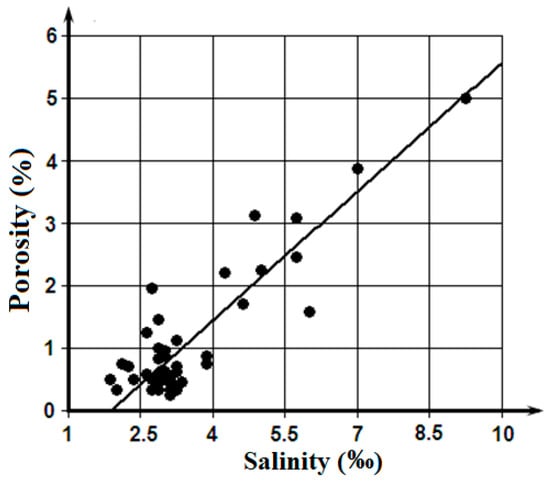 Figure 4 presents a linear regression of porosity on salinity. These results show that a high correlation between porosity and salinity is connected to the largest values of these parameters, which amounts, approximately, to 1/5 part of an array. The main bulk of data are grouped in the minor area—S < 4‰ and P < 1%— where any statistically significant interdependence between porosity and salinity is difficultly to establish.