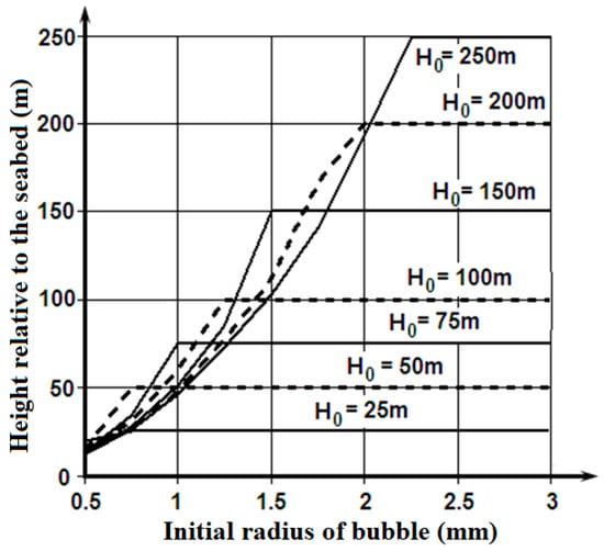 Height relative to the seabed (H) to which methane bubbles with various initial dimensions (R0) are capable of floating up from the various depths of emission (H0).