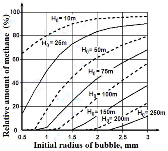 The considered mechanism can also apply to the deep-water sources of the bubbles containing methane, which form plumes on the marine natural gas fields. In that case, there is consecutive transformation during the gas bubbles’ floating up process: the bubble with methane—the globule of crystalline hydrate of methane []. Disintegration of the formation of crystalline hydrate of methane globules of the usual bubbles can occur at depths of 200–150 m. The following process of the gas bubble floating up is similar to the one modelled previously, and the results in Figure 5 and Figure 6 are applicable to it.