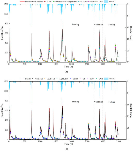 Data-driven runoff prediction models exploit complex nonlinear relationships between input and output data. By utilizing vast amounts of hydrological data, these models establish high-precision, high-timeliness machine learning models to process unknown samples, thereby achieving the goal of simulating and predicting runoff. Flood simulation and prediction models based on machine learning algorithms can bypass constraints imposed with generalized and assumed hydrological processes of a basin. They also have strong capabilities for discovering the basin’s runoff generation and convergence patterns and are easy to implement with efficient and fast computations, significantly enhancing the timeliness of flood simulation and prediction. Commonly used machine learning methods for flood simulation include Regression Analysis (RA), Support Vector Machines (SVMs), Artificial Neural Networks (ANNs), Recurrent Neural Networks (RNNs), Decision Trees (DTs), and Random Forests (RFs). Based on the dimensions of model input factors, runoff prediction models are primarily divided into single-factor driven models [9] based on runoff autoregression and multi-factor-driven models [10] based on hydro-meteorological inputs. Valipour [11] used a Seasonal Autoregressive Integrated Moving Average (SARIMA) model to predict annual runoff for various states of the United States. Duan Yong et al. [12] constructed an improved Backpropagation (BP) neural network model for daily runoff prediction at hydrological stations in the middle reaches of the Yellow river, achieving better prediction accuracy compared to autoregressive models. Multi-factor-driven runoff prediction models start from physical causes, using monitoring data such as precipitation, evaporation, and temperature as inputs and employing machine learning algorithms to predict runoff. Kratzert et al. [13] used an LSTM model to simulate characteristics of 241 catchments in the United States, demonstrating that the LSTM model could effectively represent the correlations and variations between rainfall and runoff sequences, thus better predicting river runoff processes. Chiang et al. [14] constructed an RNN-based multi-step runoff prediction model based on hydrometeorological and numerical weather prediction information, achieving good prediction accuracy within a lead time range of 1–6 h. Kan et al. [15] considered rainfall and antecedent runoff as model input factors, taking into account factors influencing runoff such as rainfall and the wetness of the underlying surface and obtained satisfactory runoff prediction results.
