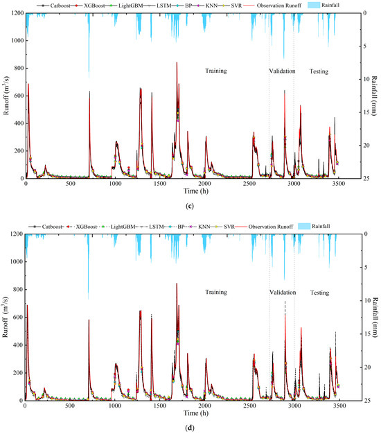 Comparison of flood forecasting using machine learning models during the training, validation, and testing periods for a prediction period of 1 to 6 h: (a) prediction period T = 1 h; (b) prediction period T = 2 h; (c) prediction period T = 3 h; (d) prediction period T = 4 h; (e) prediction period T = 5 h; (f) prediction period T = 6 h.