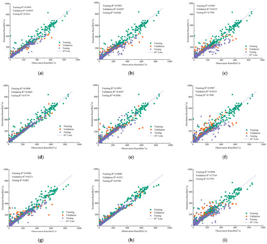 Scatter plots of observed and simulated flows for seven different models during the training, validation, and testing periods under various prediction periods: (a) CatBoost, T = 1 h; (b) CatBoost, T = 3 h; (c) CatBoost, T = 6 h; (d) XGBoost, T = 1 h; (e) XGBoost, T = 3 h; (f) XGBoost, T = 6 h; (g) LigthGBM, T = 1 h; (h) LigthGBM, T = 3 h; (i) LigthGBM, T = 6 h; (j) LSTM, T = 1 h; (k) LSTM, T = 3 h; (l) LSTM, T = 6 h; (m) BP, T = 1 h; (n) BP, T = 3 h; (o) BP, T = 6 h; (p) KNN, T = 1 h; (q) KNN, T = 3 h; (r) KNN, T = 6 h; (s) SVR, T = 1 h; (t) SVR, T = 3 h; (u) SVR, T = 6 h.