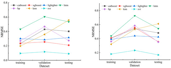 - The NRMSE values of the seven models on the testing dataset are sometimes higher than those on the validation dataset but lower than those on the training dataset, indicating good generalization ability. As the lead time increases, the NRMSE values gradually decrease on the training, validation, and testing datasets, suggesting a gradual decline in generalization ability.