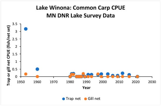 We obtained historical carp catch data for Lake Winona from the Minnesota Department of Natural Resources LakeFinder Lake Survey Results (https://www.dnr.state.mn.us/lakefind/showreport.html?downum=85001100 [accessed on 15 August 2024]). Catch records, based on fish management surveys with overnight sets of standardized trap nets (double frame, 1.2 × 1.8 m, 1.9 cm mesh, 12.2 m lead; set perpendicular to shore in water <2.4 m deep) and gill nets, were available for 21 dates between 1953 and 2021. These data were examined to assess potential changing patterns in carp abundance during the period that included pre-reclamation, post-reclamation, and more recent times.