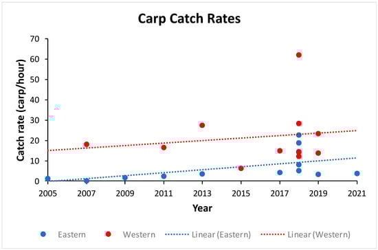 We suspected that carp populations in both the basins of Lake Winona had been increasing during the past 20 years, based on more frequent collections of carp and observations of increased spawning activity within the lake (N. Mundahl, personal observations). Although historical trap net catch rates did not indicate any increase in carp abundances in Lake Winona since 1980, our electrofishing catch rates indicated that carp numbers in both basins appeared to be trending upward, especially in the eastern basin. Trap nets may not provide a very good estimate of adult carp abundance, as carp are known to be cautious (not risk-taking) about new objects in their environment and tend to avoid or escape from different types of visible set nets, especially when in groups [,,]. Less-visible gill nets are effective at capturing carp in other systems throughout Minnesota [], but they only captured five carp across 21 lake surveys between 1950 and 2021 in Lake Winona. In contrast, shoreline electrofishing has been proven to accurately estimate common carp abundances in systems similar to Lake Winona []. Although the gradual increases in carp catch rates observed in Lake Winona do not appear as threatening as the extremely rapid increase in carp numbers reported in other systems [,], they are still worrisome when considered in the context of the current carp densities within Lake Winona.