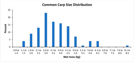 During seven years between 2007 and 2018, 113 carp (20 from the eastern basin and 93 from the western basin) were weighed. Carp ranged in wet mass from 1.19 kg to 8.05 kg, with the majority between 2.1 and 4.5 kg (Figure 5). Mean ± SD carp masses were 3.2 ± 1.3 kg for the eastern basin and 3.5 ± 1.2 kg for the western basin. Because the mean carp mass did not differ significantly (t111 = 0.89, p = 0.374) between the basins, data were combined to produce an overall mean carp mass of 3.4 ± 1.2 kg per fish for Lake Winona.