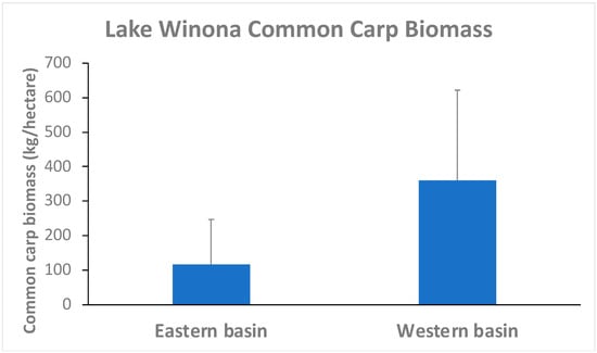 The estimated carp biomass in both the eastern (116 kg/ha) and western (360 kg/ha) basins of Lake Winona are equal to or exceed the levels (50 to 100 kg/ha) considered potentially damaging to lake ecosystems [,,,]. When the carp biomass exceeds 50 kg/ha, aquatic macrophyte cover declines precipitously, plant richness becomes suppressed, and non-native plant species may become dominant [,,,]. Even if carp can be subsequently removed from a system, the recovery of the macrophyte community may be prolonged and/or incomplete without significant intervention(s) [].