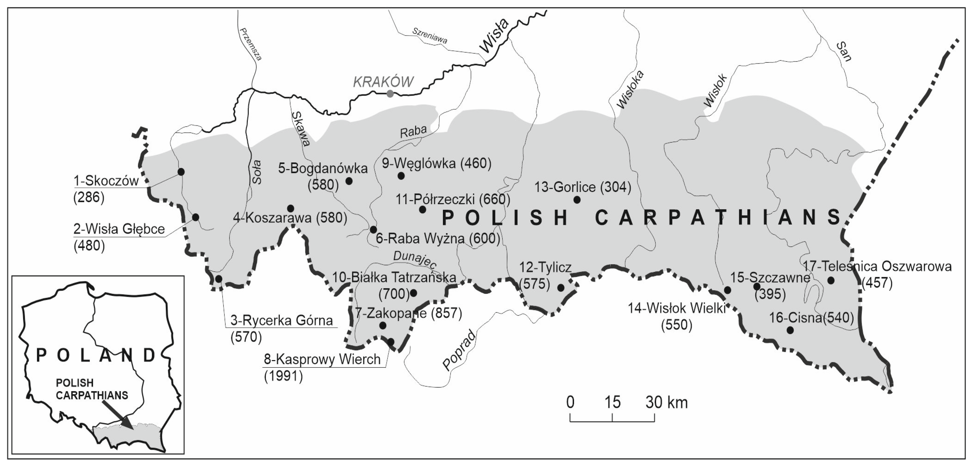 - Obrębska-Starklowa, B.; Hess, M.; Olecki, Z.; Trepińska, J.; Kowanetz, L. Klimat. In Karpaty Polskie, Przyroda, Człowiek i Jego Działalność; Warszyńska, J., Ed.; Wydawnictwo Uniwersytet Jagielloński: Kraków, Poland, 1995. [Google Scholar]