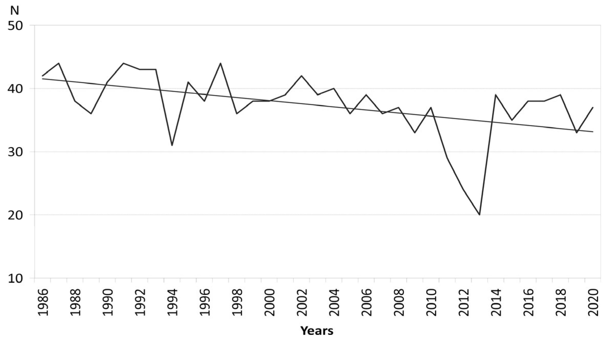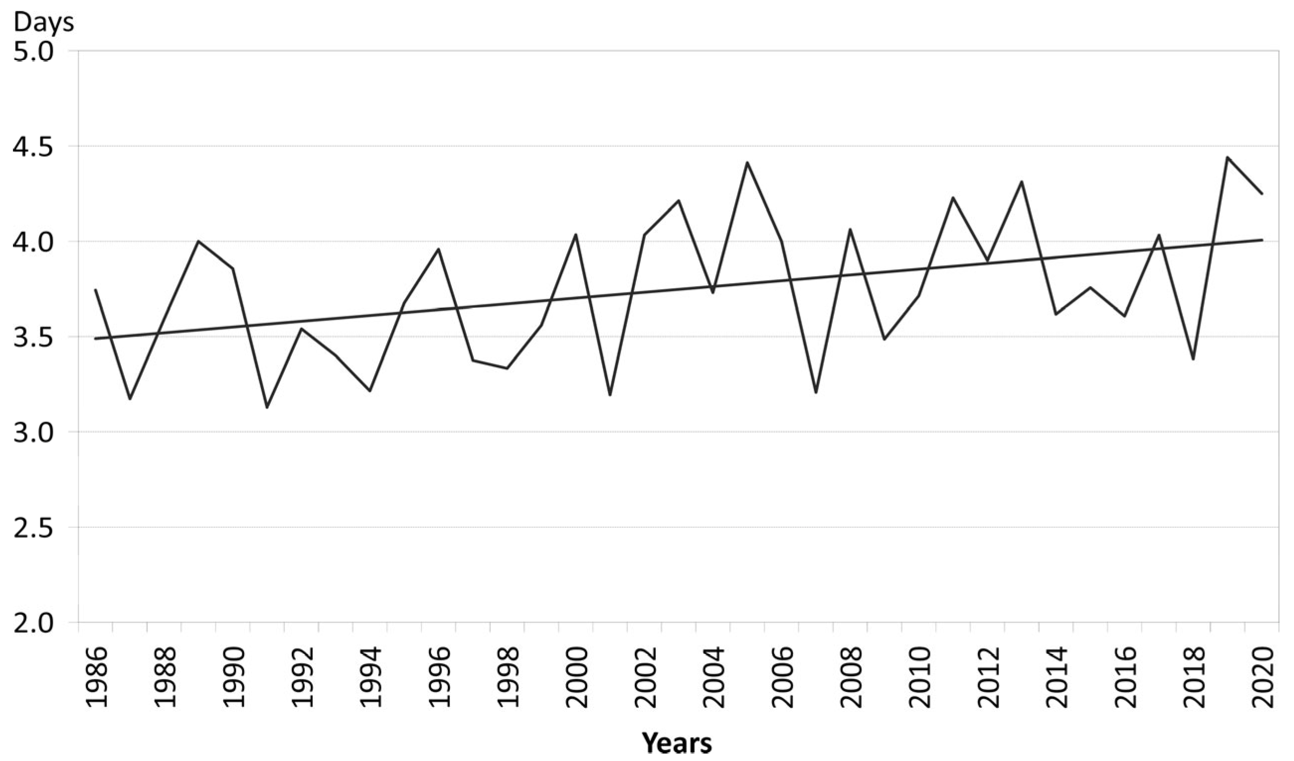 | Meteorological Station | Mann–Kendall Statistic (Z) | p-Value | R2 | Slope (Number of Days/Year) | |