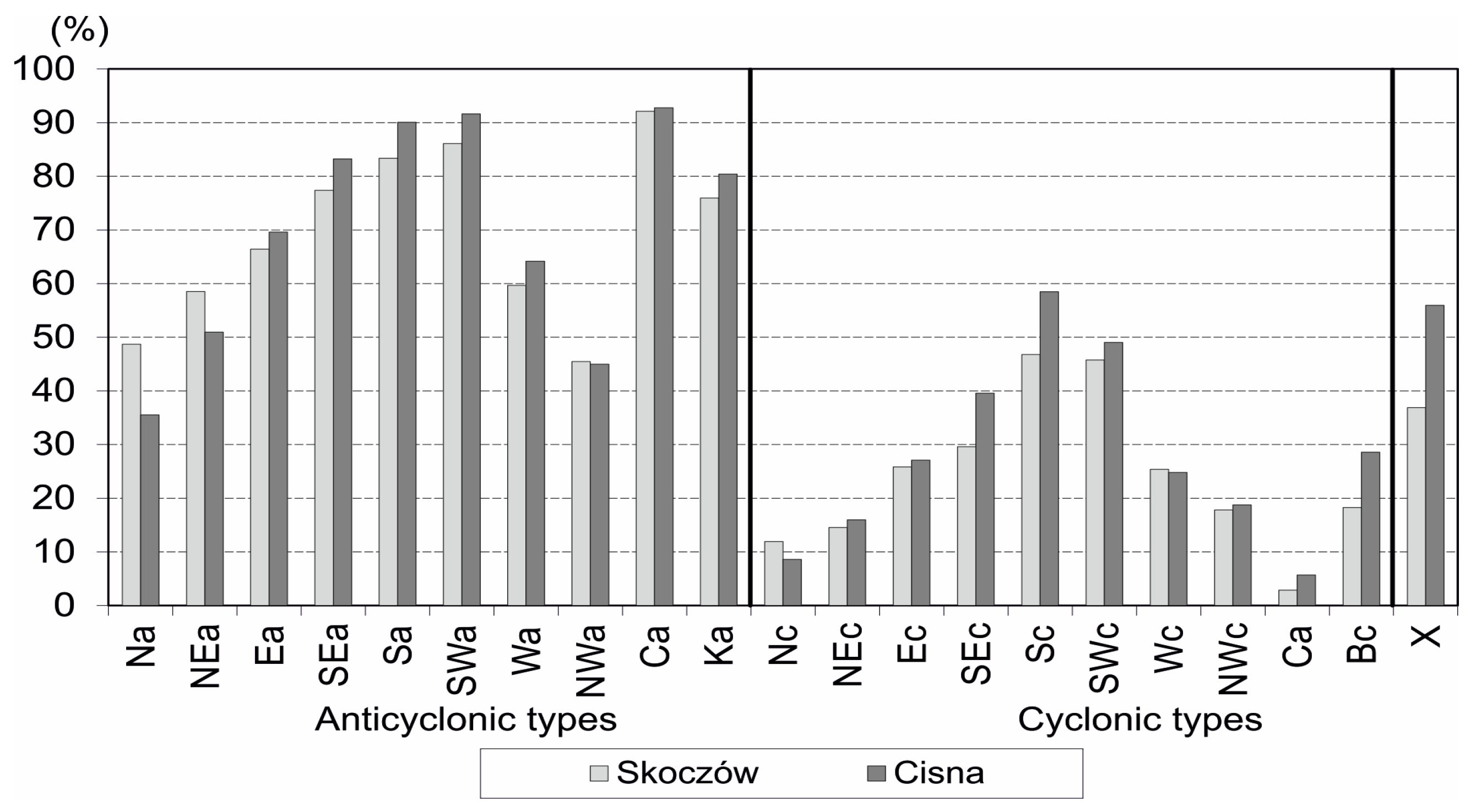 | NWa, NWc | —Types with an advection of air masses from the northwest; |
