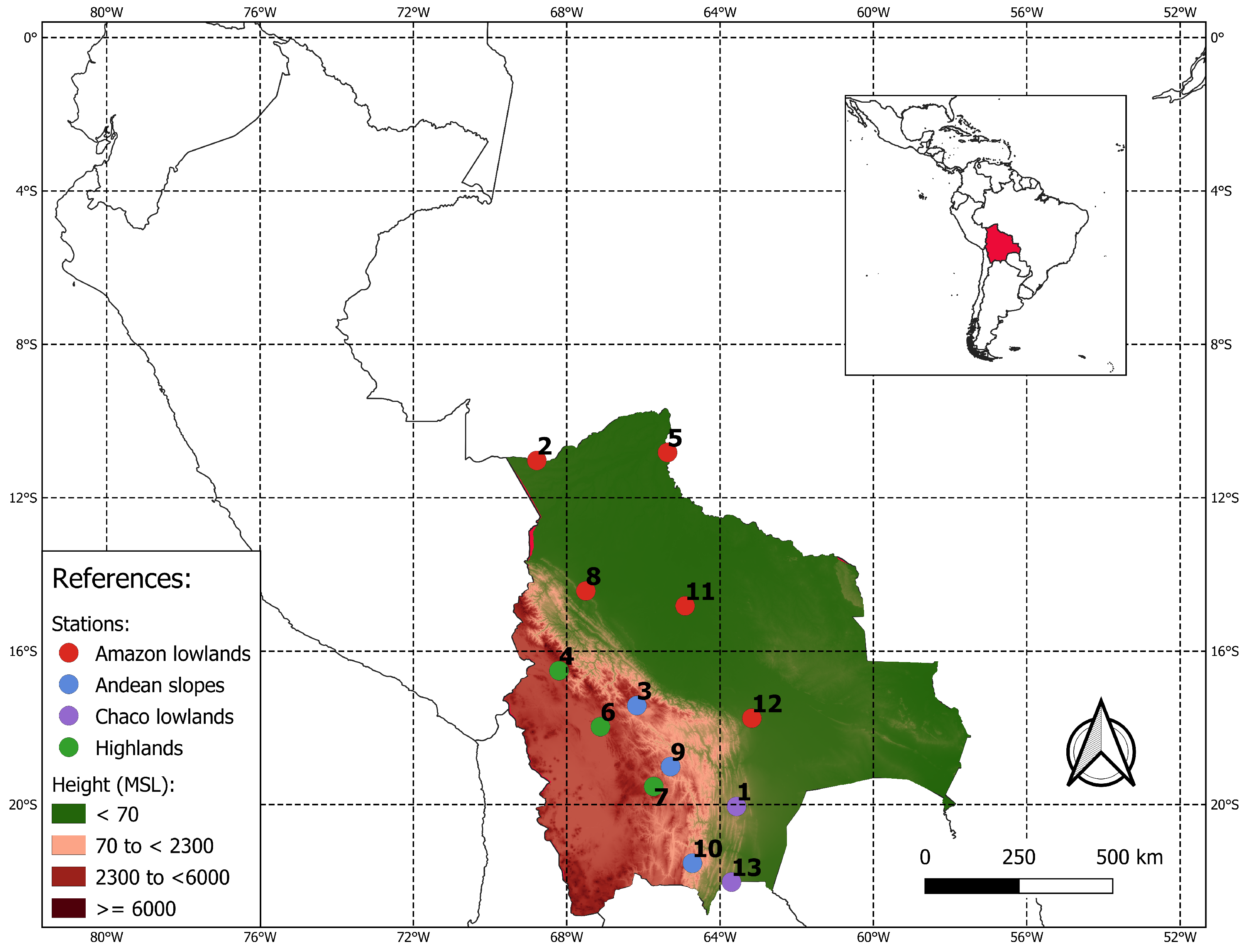 Located in the center of South America, Bolivia is a country with large variations in topography. Some regions are as high as 6500 m.a.s.l., contrasted with others at less than 800 m.a.s.l. (Figure 1). It also contains much diversity in ecosystems and landscapes. These factors shape the temperature and precipitation of the different regions in the country. A standard classification of the different zones in the country in terms of altitudes is as follows [21]: the lowlands (<800 m.a.s.l.), the Andean slopes (between 800 and 3200 m.a.s.l.) and the highlands (between 3200 and 6500 m.a.s.l). Although the climatic conditions can be highly different within each zone, some common characteristics exist.