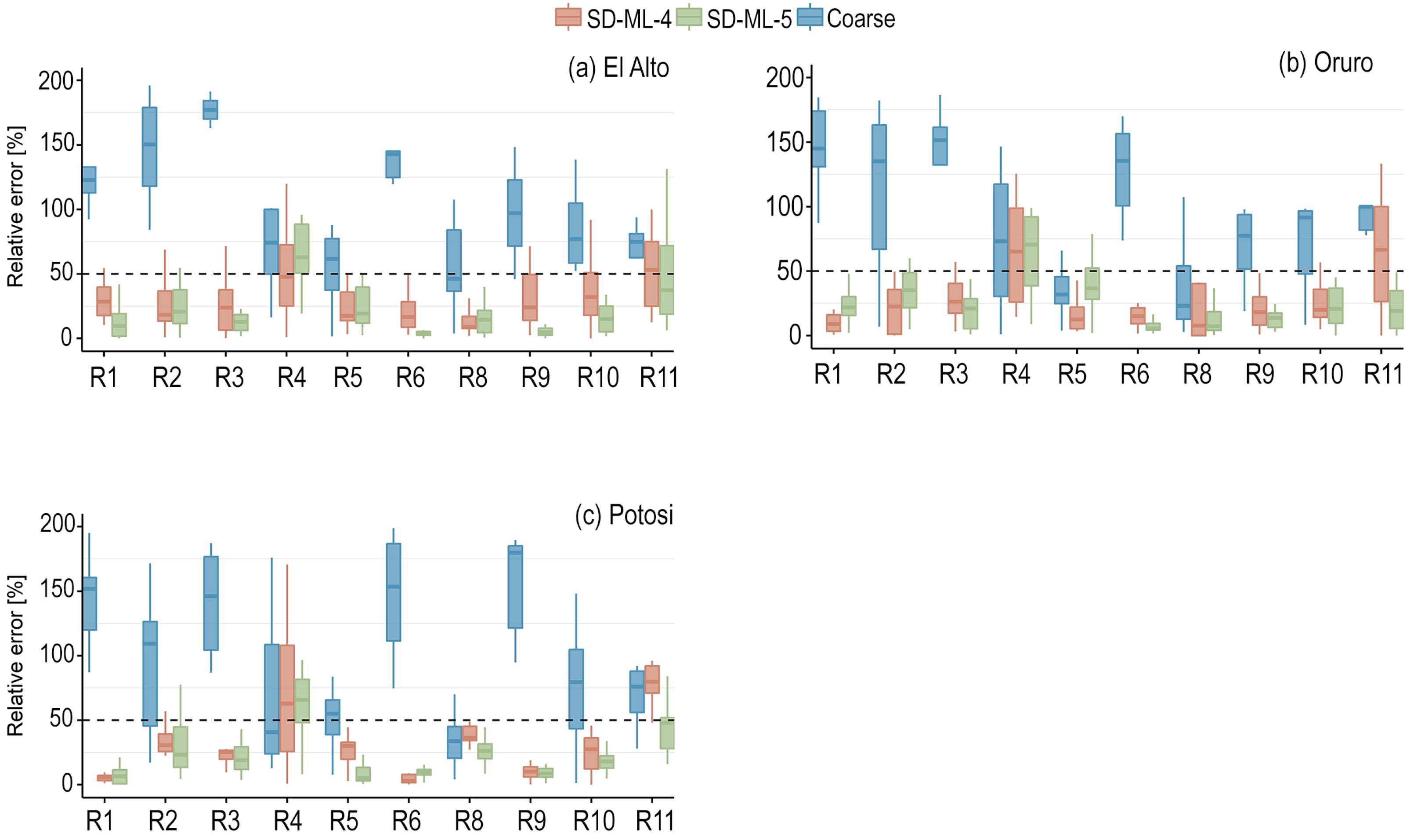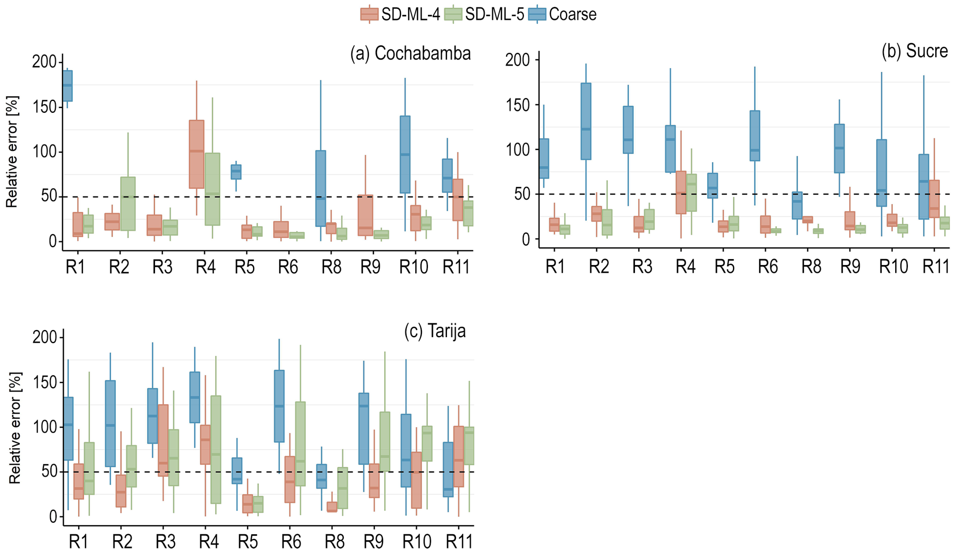 Figure 3 shows the relative errors in the stations of the Andean slopes. Again, similar patterns are seen in the relative errors of the coarse scale (raw GCM outputs), except for Cochabamba, in which the relative errors were larger than 200% for R2, R3, R4, and R6. In the mentioned indicators, the correction of the SDMs brought the indicators to less than 50% of relative error except for R4 (winter precipitation). However, despite the large relative error in R4, the added value of the methodologies was clear. Tarija station showed slightly different patterns, with a larger relative error and a larger interquartile range (more variability). Compared to Cochabamba and Sucre stations (where in most cases, the relative errors were below 25%), many indicators showed relative errors larger than 50%. The zone stations generally showed small relative errors (less than 50%) in R5 and R8, with smaller variability (smaller interquartile range) compared to the raw outputs except for SD-ML-5 for R8 in Tarija. This is important to emphasize since R5 and R8 denote the maximum duration of dry spells and the daily precipitation intensity for a 10-year return period, respectively, which were the most representative indicators for droughts and floods in this work.