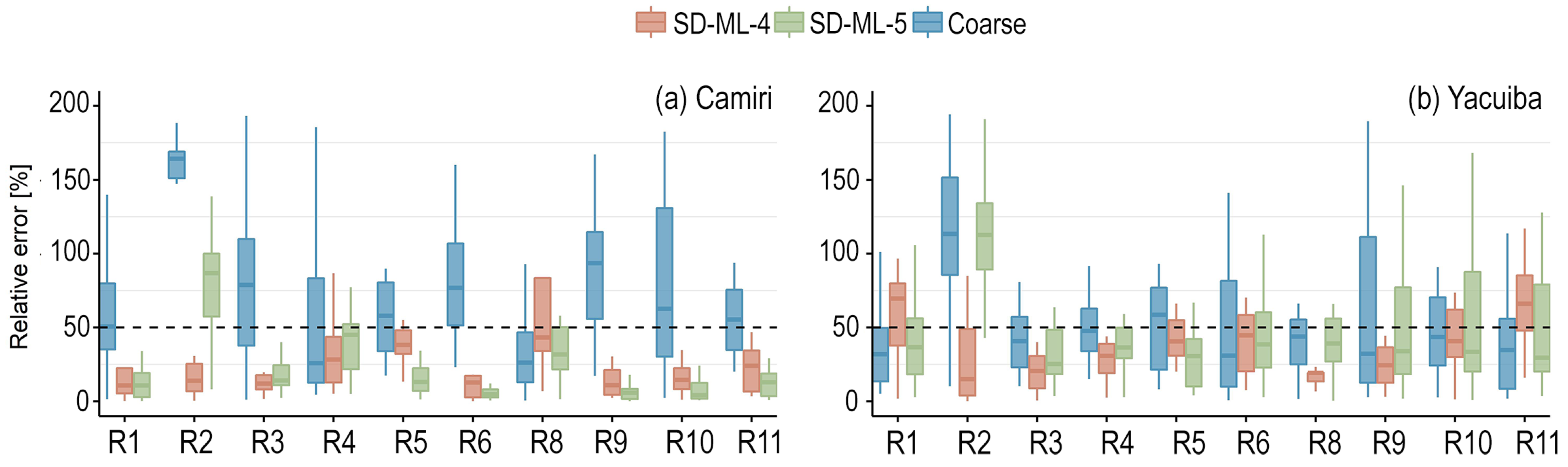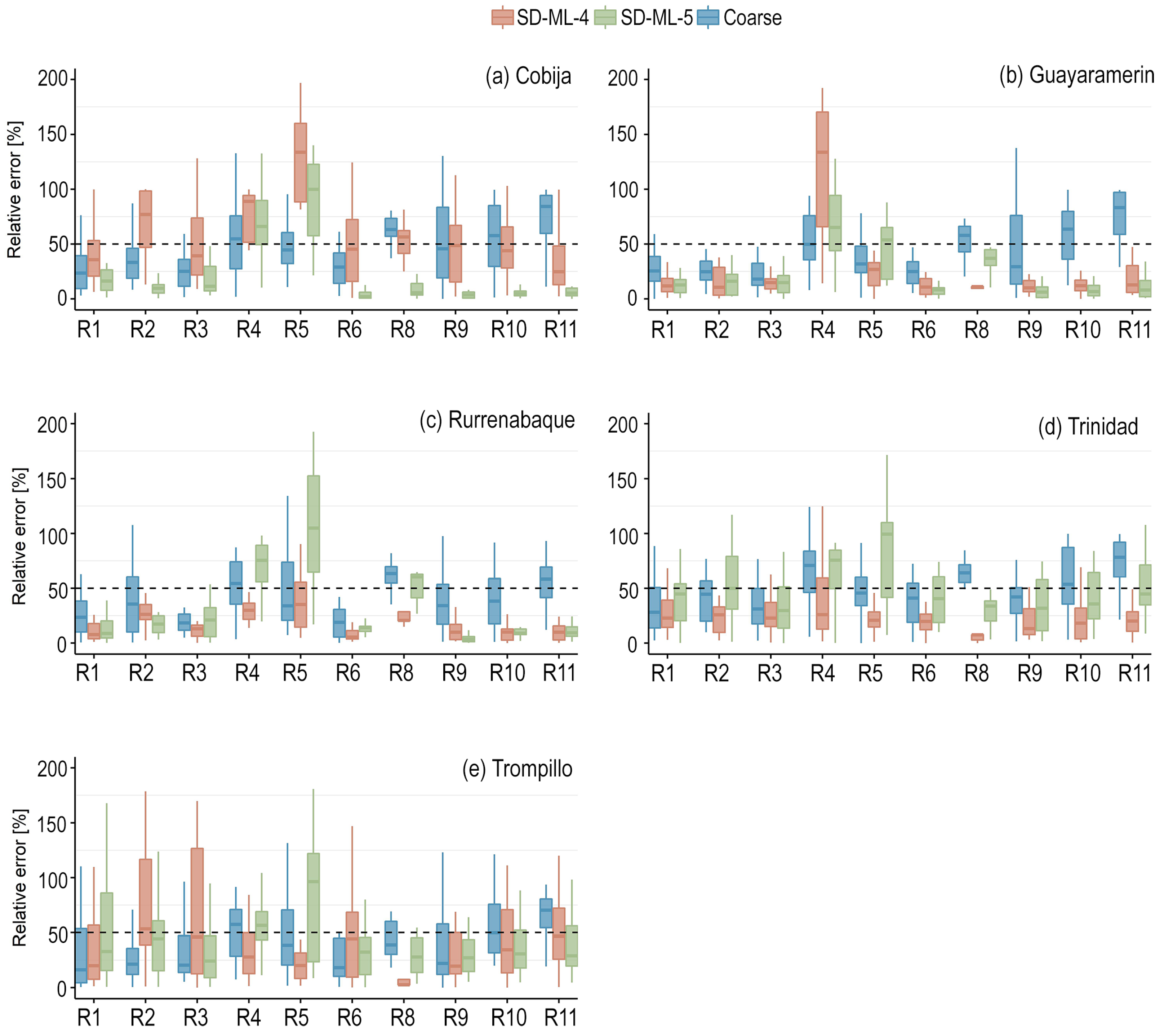 The GCMs generally showed good skill in this zone (Figure 4). The majority of the relative errors for the indicators were below 50%. Hence, the added value from the SDMs was more difficult to investigate, and sometimes there was none (raw GCM data had a similar skill or was a better predictor). However, looking at Figure 4 in detail, one can notice that the SDMs performed well in R8 by reducing the relative error of the GCMs to less than 25%. For the mentioned indicator, SD-ML-4 showed a better downscaling in Guayaramerin, Rurrenabaque, Trinidad, and Trompillo, and SD-ML-5 in Cobija. Regarding winter precipitation (R4), the results showed poor skill (no added value) in Cobija, Rurrenabaque, and Guayaramerin, while in Trinidad and Trompillo, SD-ML-4 obtained reliable downscaled results with a median relative error of around 25%. Except for Cobija, SD-ML-4 outperformed SD-ML-5 in R5 (maximum duration of dry spells). Interestingly, in Cobija, the opposite happened in R8 (10-year return period precipitation). In all cases of high precipitation occurrences (R9, R10, and R11), both methodologies reduced the median relative error to less than 50%.