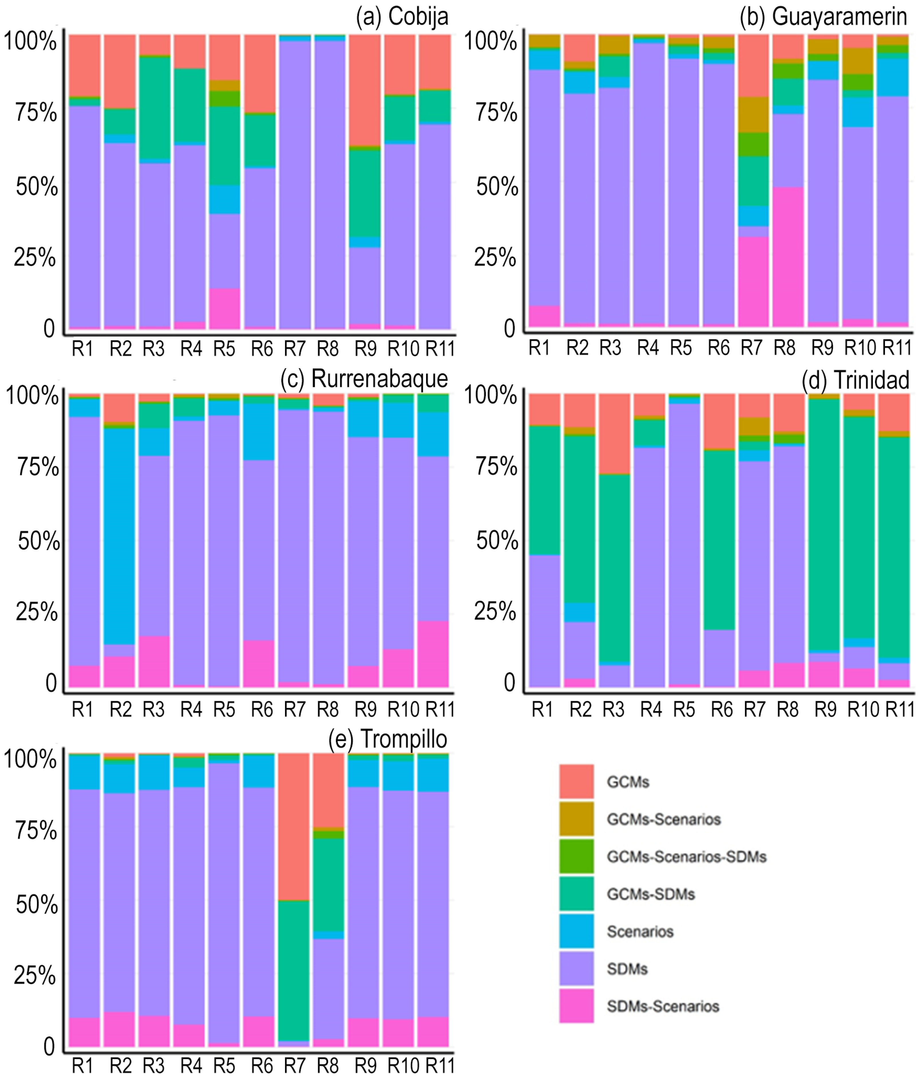 Compared to the highlands and Andean slopes, the Amazon lowlands contained a heterogeneous pattern (Figure 8). Although the SDMs had the highest uncertainty share in most cases, there were important contributions from the GCMs. Moreover, in some locations and indicators, the GCMs took over (e.g., R7 in Trompillo). Note that in Trinidad, the uncertainty share of the GCM–SDM interaction took over in most cases. The change in the pattern of the uncertainty contribution in Trinidad must be elaborated further as this increase in the interaction´s share could mean that in that zone, the use of a certain SDM method can give large differences in the results.