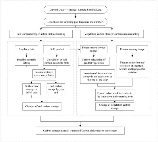 The data flow and technical methods for monitoring and evaluating carbon sink capacity in the small watershed are as follows: First, sampling points and quantities are determined by integrating current data and historical remote sensing data. Next, the carbon stocks, or carbon sinks, of both soil and vegetation are calculated. Utilizing auxiliary data, field sampling, forest carbon stock models, and remote sensing imagery, methods such as establishing baseline scenarios, inverse distance spatial interpolation, sample calculations, and feature extraction are employed to estimate forest carbon stocks for the initial and final years. This enables the determination of soil and vegetation carbon stocks for different years, allowing for an analysis of their variations. Consequently, the carbon stocks or carbon sink capacity of the small watershed can be evaluated. The technical route is illustrated in Figure 2.