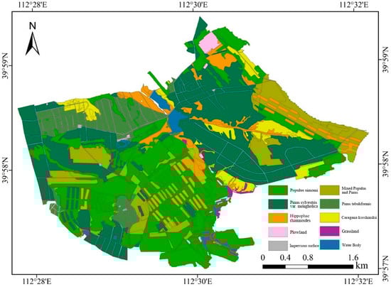 Considering the interference caused by cloud noise on cloud research areas and the synchronization of phenological periods with historical imagery, dual-time remote sensing imagery data were sourced from the Landsat series satellites of the United States (level two data after atmospheric correction, consisting of six-band multispectral images with a resolution of 30 m). The imagery closest to the survey date, from 11 July 2024, was selected, along with historical data from 14 July 2002, which is nearest to the project’s commencement. To enhance the accuracy of vegetation cover data and the timeliness of matching with ground surveys, a fused image combining multi-spectral data from the Sentinel-2 satellite on 24 July 2024 and imagery from the Jilin-1 satellite from 2023 (with a spatial resolution of 2 m) was utilized as the base map. Spatial overlay was performed on the coverage types of the vector maps from the national land survey and the second forest classification, integrating the distribution of dominant tree species in forested areas. This ultimately resulted in the identification of ten land cover types: Populus simonii, mixed Populus and Pinus, Pinus sylvestris var. mongholica, Pinus tabuliformis, Hippophae rhamnoides, Caragana korshinskii, cultivated land, grassland, impervious surfaces, and water bodies (Figure 3). Among these, the last four types are classified as non-forested land and are not included in carbon sink measurements. The first six cover types, however, exhibit significant differences in carbon storage due to the types and growth characteristics of the vegetation, which subsequently influences the spatial pattern of vegetation carbon density at the watershed scale. Consequently, binary raster maps were generated for these six types, with a spatial resolution that matches that of the Landsat imagery, thereby preparing the foundational data required for constructing the vegetation carbon storage model. Additionally, calculations were performed on the different bands of the Landsat imagery to produce several vegetation indices, including the Simple Ratio (SR), Normalized Difference Vegetation Index (NDVI), Soil-Adjusted Vegetation Index (SAVI), and Modified Normalized Difference Vegetation Index (MNDVI) [,,].