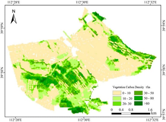 Since the remote sensing data used has undergone radiometric calibration and atmospheric correction, the variables of this model are also applicable to the remote sensing data variables from 2002. By inputting the vegetation indices and land cover distribution dummy variables from the 2002 remote sensing images, the spatial data for vegetation carbon storage in 2002 can be obtained (Figure 5).