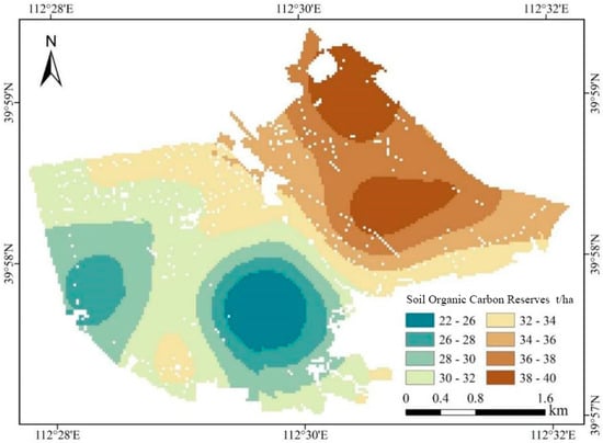 The spatial distribution map of surface soil organic carbon storage indicates that the soil organic carbon storage in the northeastern area of the project region is greater than that in the southwestern area. This is associated with the fact that the northeastern area was previously cultivated land, which was converted to shrubland to mitigate soil erosion in the local watershed. The conversion of cultivated land to shrubland contributes to the higher surface soil organic carbon levels in this area. In contrast, the southwestern area is designated as Xiaonanshan Mountain Park, where the potential for soil and water erosion is greater than in the flatter regions.