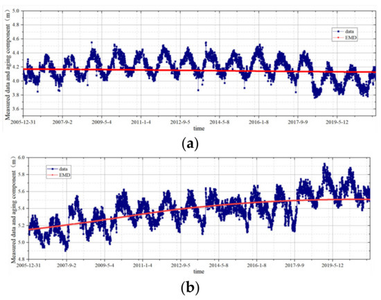 In summary, when constructing the aging component using the above approach, and considering the different operational states and environments of various hydraulic structures, it is necessary to take targeted measures for optimization. In this study, Empirical Mode Decomposition (EMD) is employed to decompose the aging component in the measured data. This allows for the establishment of a response function for the aging component in the dam, replacing Equation (5) in constructing a multi-source time series analysis model.