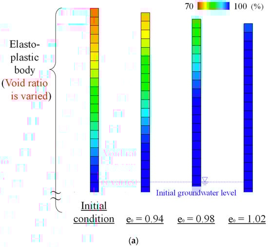 In the previous section, the initial void ratio of the entire sand layer was changed, but, in this section, the computations were performed when the initial void ratio was varied only in the unsaturated sand layer above the groundwater level, and only the unsaturated sand layer was modeled as a linear elastic body (Young’s modulus: 2.58 × 104 kPa; Poisson’s ratio: 0.2). Specifically, based on the case where the initial void ratio e0 was 0.98, the same as in Section 3, the computations were performed for the cases where the void ratio only in the unsaturated sand layer was reduced to e0 = 0.48 and increased to e0 = 1.48. Figure 14 shows the distributions of degree of saturation, pore water pressure, and the amount of water absorption in soil element, when the excess pore pressure in the sand layer completely dissipated. The distributions of degree of saturation and pore water pressure show that the smaller the void ratio of the unsaturated sand layer, the higher the groundwater level rose. Further, the distributions of the amount of water absorption show that the amount of consolidation drainage from the saturated sand layer was almost the same in any case. Thus, because the elastic unsaturated sand layer does not cause negative dilatancy (plastic volume compression) due to excitation, if the amount of consolidation drainage from the saturated sand layer (plastic volume compression) is almost the same, the smaller the void ratio of the unsaturated sand layer, the higher the groundwater level rise, based on the mechanism explained in Figure 12. Furthermore, we also analyzed the case where the entire ground, including the saturated sand layer, was modeled as the elastic body, which is also shown in Figure 14. Because the groundwater level changes due to dilatancy (plastic volume change) induced by excitation, the elastic analysis cannot represent the groundwater level fluctuation demonstrated in this paper, indicating the importance of elastoplastic analysis in the seismic response analysis of the ground.