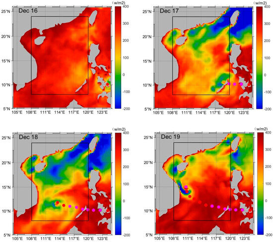 The maintenance and development of typhoons heavily rely on the energy and water vapor supplied by the underlying surface heat flux. Thus, studying changes in sea surface heat flux for typhoon response holds significant importance [21]. In this study, we employed the heat balance equation to calculate variations in heat flux during Typhoon Rey (Figure 7).